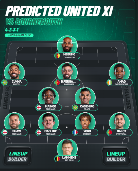 Carrick is likely to go with the same back-four he deployed against Villa. This means Diogo Dalot at right-back, Luke Shaw and the opposite flank and a central defensive pairing of Harry Maguire and Leny Yoro.
